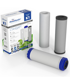Комплект картриджей К-1 АКВАБРАЙТ СТАНДАРТ для очистки воды (ПП-5, УГП-10, УГА-10) комплект картриджей Стандарт устанавливается в фильтры стандарта Слим Лайн (высота колбы фильтра 254 мм) под кухонную мойку и предназначен для доочистки питьевой воды для личных целей. 1-я ступень очистки используемый картридж ПП-5М Очистка воды от механических загрязнений, таких как: песок, ил, ржавчина и т. п. 2-я ступень очистки используемый картридж УГА-10 Сорбционная очистка воды от хлора, органики, микроорганизмов. 3-я ступень очистки используемый картридж УГП-10 Финишная очистка воды от хлора, органических соединений, улучшает вкус, запах, цвет.