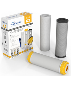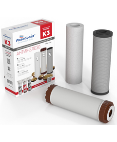 Комплекты картриджей Аквабрайт К-3, предназначен для установки в трёхступенчатые системы предварительной очистки холодной воды Аквабрайт абф-триа, а также в системы обратного осмоса Аквабрайт АБФ ОСМО-5, АБФ ОСМО-6, Аквафор, Барьер, Гейзер, Новая Вода, Атолл, AquaPro, ATOLL, Raifil и других. Размер картриджей имеет стандарт 10 Slim Line, что позволяет использовать комплект К-3 в системах: Аквафор, Барьер, Гейзер, Новая Вода, Атолл, AquaPro, ATOLL, Raifil и других. Характеристики: 1-я ступень ПП-5M Механическая очистка. Картридж ПП-5М предназначен для очистки воды от ржавчины и механических частиц размером свыше 5 мкм. 2-я ступень ФП-10 Картридж аквабрайт ФП-10 с засыпанным в корпус окислителем МЖФ. Предназначен для очистки воды от растворенного железа, органических соединений. 3-я ступень УГП-10 Удаление органики. Картридж угп-кокос предназначен для сорбционной очистки воды от хлора, органических соединений. Улучшает органолептические показатели воды - вкус, запах, цвет