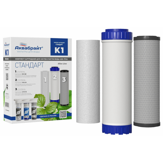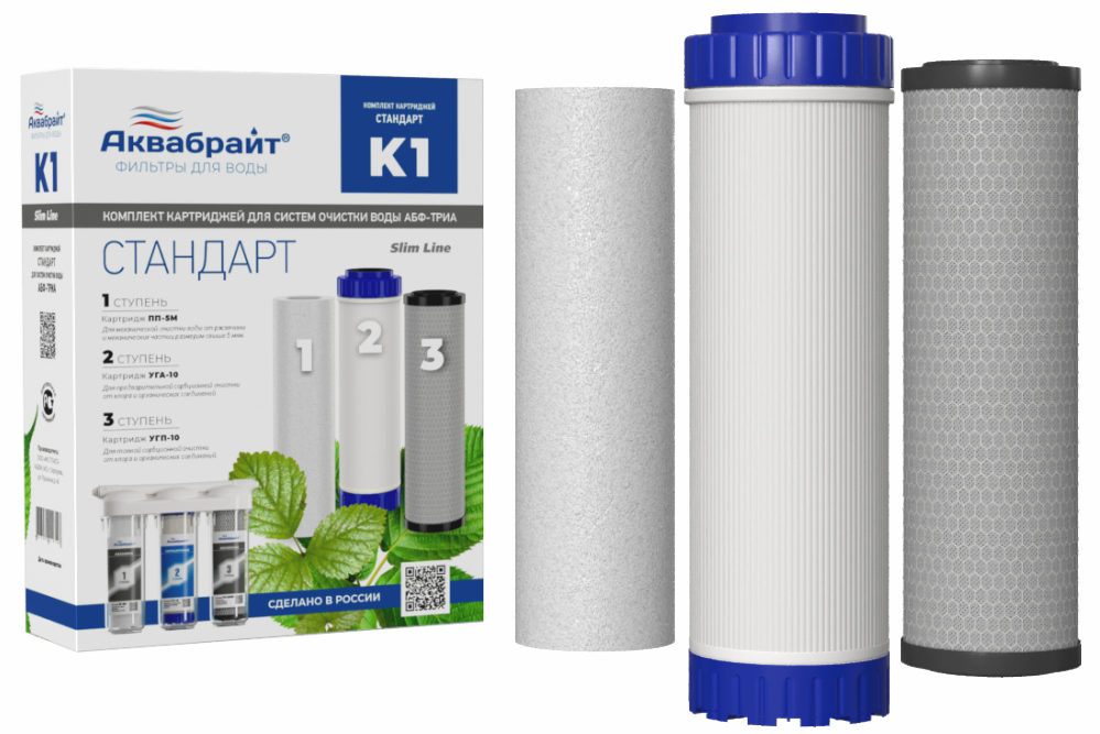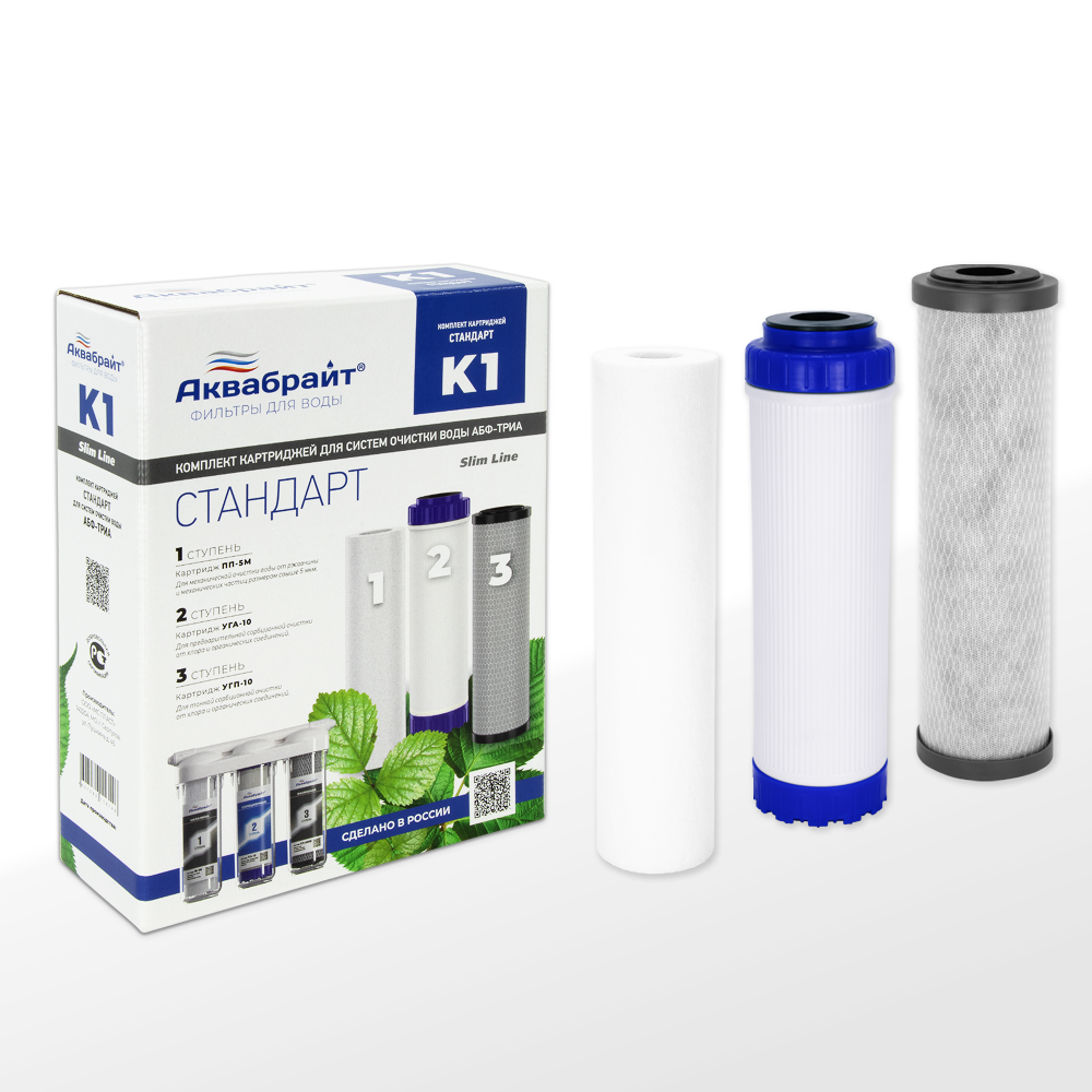 Комплект картриджей К-1 АКВАБРАЙТ СТАНДАРТ для очистки воды (ПП-5, УГП-10, УГА-10) комплект картриджей Стандарт устанавливается в фильтры стандарта Слим Лайн (высота колбы фильтра 254 мм) под кухонную мойку и предназначен для доочистки питьевой воды для личных целей. 1-я ступень очистки используемый картридж ПП-5М Очистка воды от механических загрязнений, таких как: песок, ил, ржавчина и т. п. 2-я ступень очистки используемый картридж УГА-10 Сорбционная очистка воды от хлора, органики, микроорганизмов. 3-я ступень очистки используемый картридж УГП-10 Финишная очистка воды от хлора, органических соединений, улучшает вкус, запах, цвет.